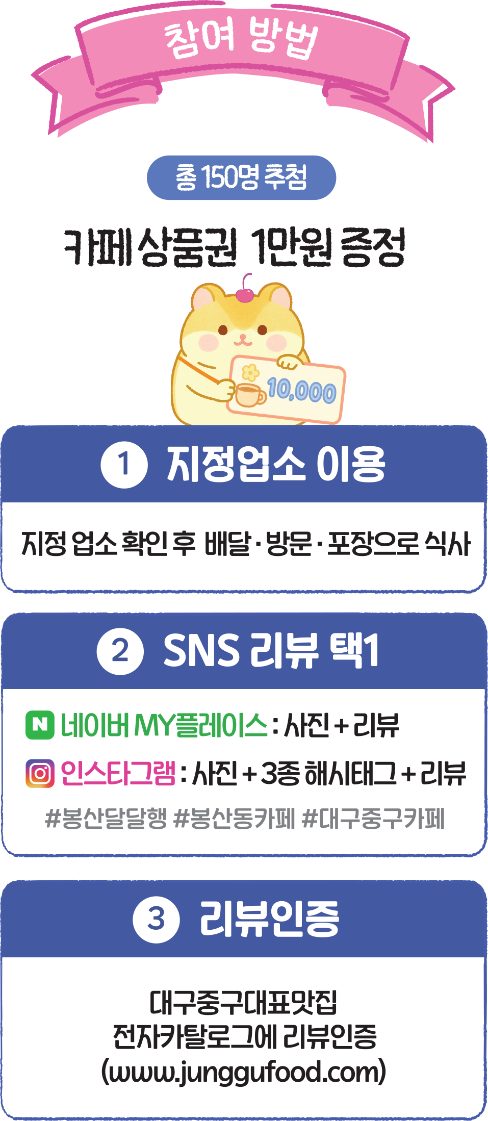 - 인스타그램: 사진 업로드 + 필수 해시태그(#봉산달달행 #봉산동카페 #대구중구카페) 입력 후 리뷰 작성 필수